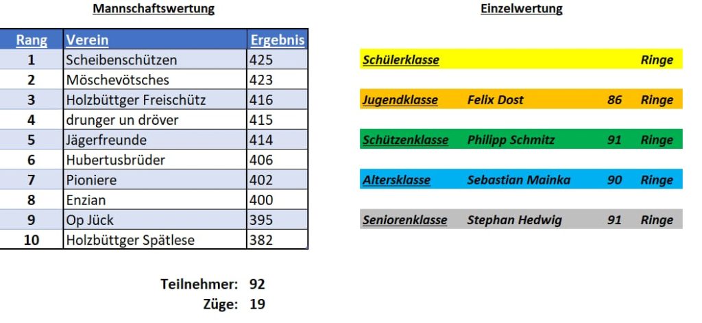 In der Mannschaftswertung setzen sich die Scheibenschützen mit 425 Ringen an die Spitze, dicht gefolgt von Möschgevötsches (423 Ringe) und dem Holzbüttger Freischütz (416 Ringe). Auch dahinter blieb es eng – drunger un dröver (415) und die Jägerfreunde (414) lieferten sich ein Kopf-an-Kopf-Rennen.